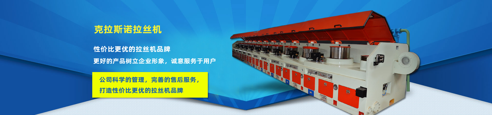 公司主要產品有:直進式拉絲機系列、水箱式拉絲機系列、倒立式拉絲機系列、快速滑輪式拉絲機系列、倒立式收線機組、盤條預處理生產線以及象鼻式卸線機、工字輪收線機、軋尖機、吊線機等輔機系列產品。公司的所有設備技術先進,實用性強,特別是倒立式拉絲機為臺灣技術,深受客戶好評。適用的范圍有低、中、高碳素鋼絲、輪胎鋼絲、不銹鋼絲、簾線鋼絲、膠管鋼絲、焊絲、電線電纜用銅絲、鋁絲、異型鋼絲等等。
